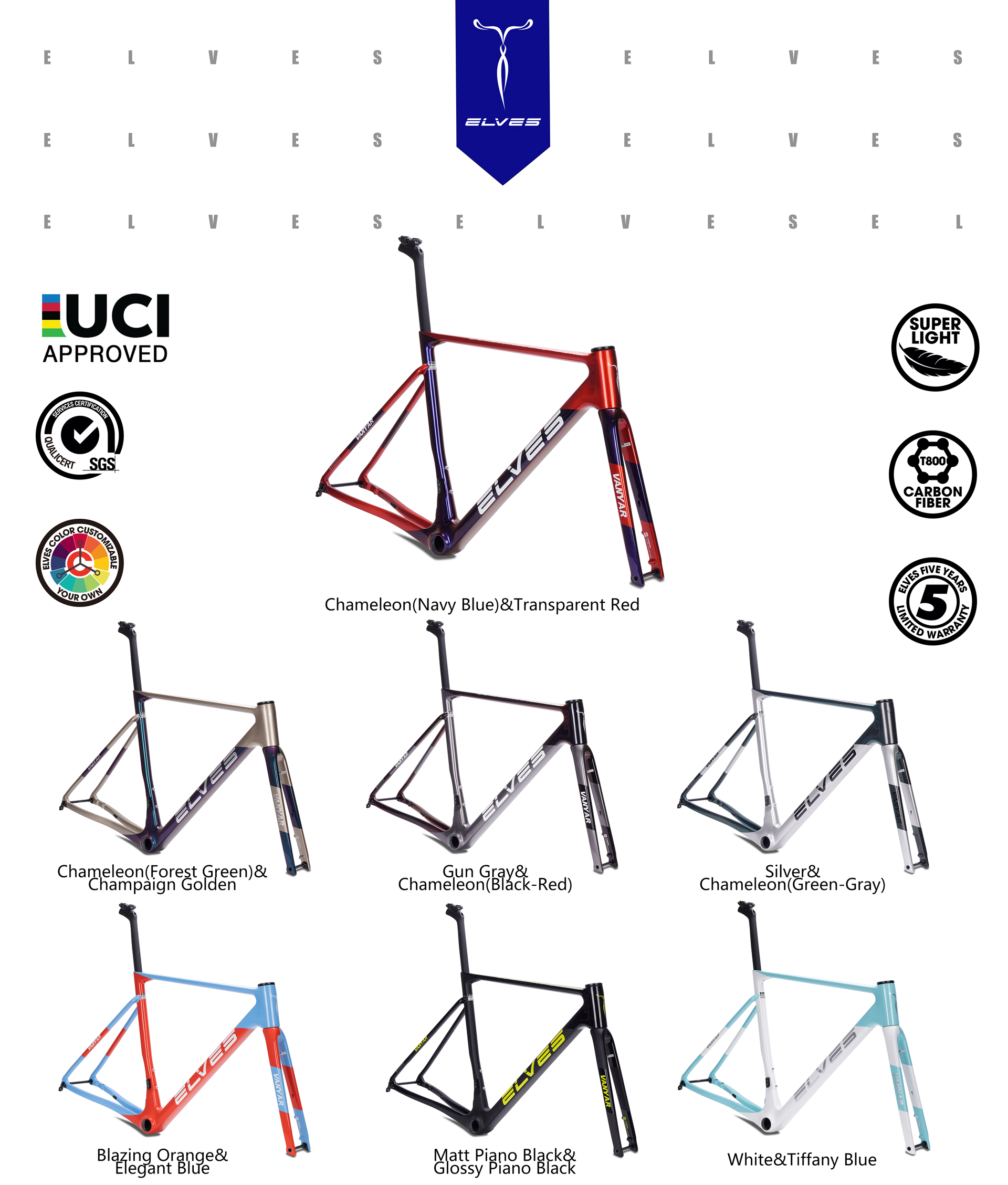 Elves Offer More Than 100 Standard Paints and More Than 10 Special Chameleon Paints for You to Build a Unique Elves Frameset! All Of Elves Framesets Are Painted with The Highest Quality and Environmental Paints Available, And the Expensive Chameleon Paints Are Often Used on Fancy Cars. We Share Them with All Elves Fans for Building Your Dream Bike!