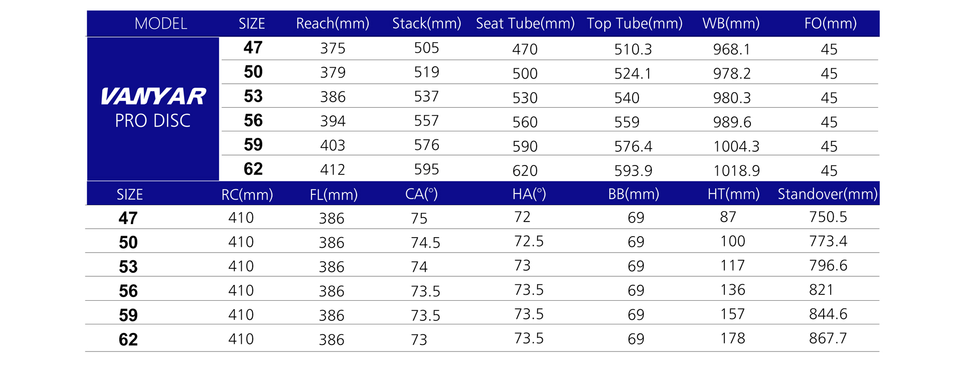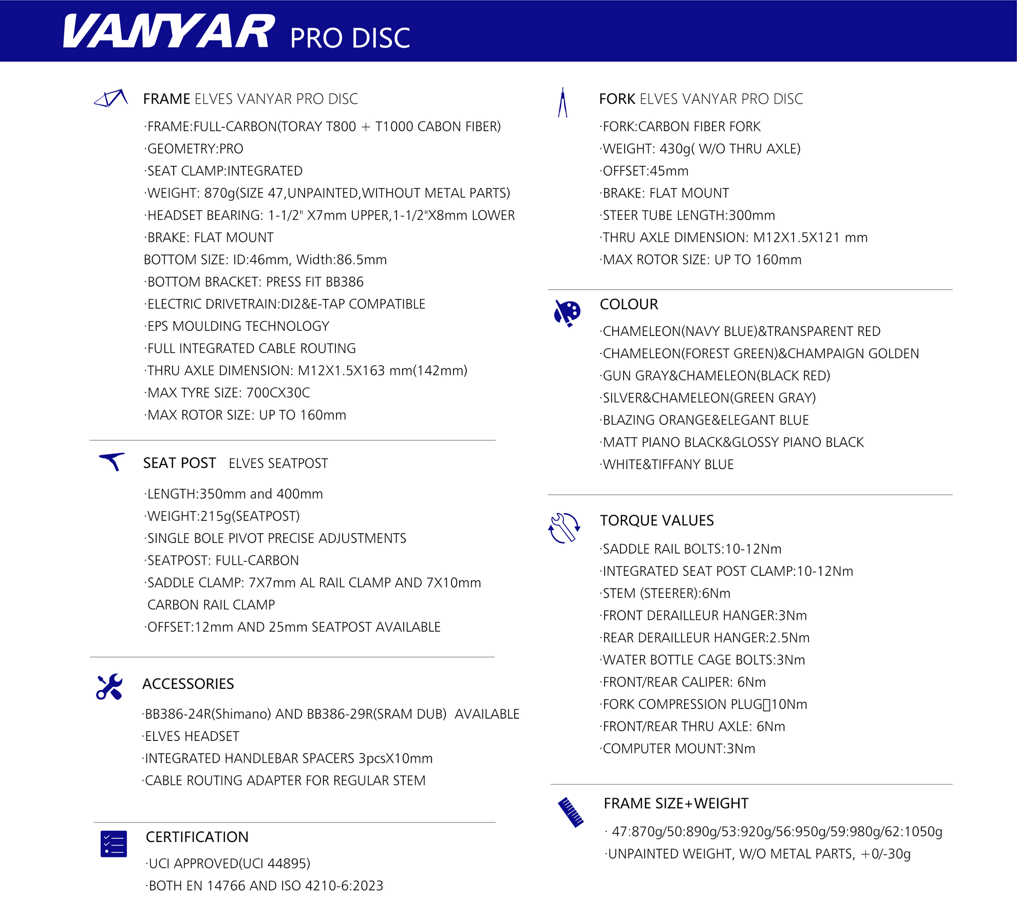 To support Elves Bikes exponential global growth and movement into the western markets, the Vanyar Pro UCI Disc 2024 is available in the following frame sizes; 47cm, 50cm, 53cm, 56cm, 59cm, 62cm. Please refer to the detailed geometry provided to gain further insight.
